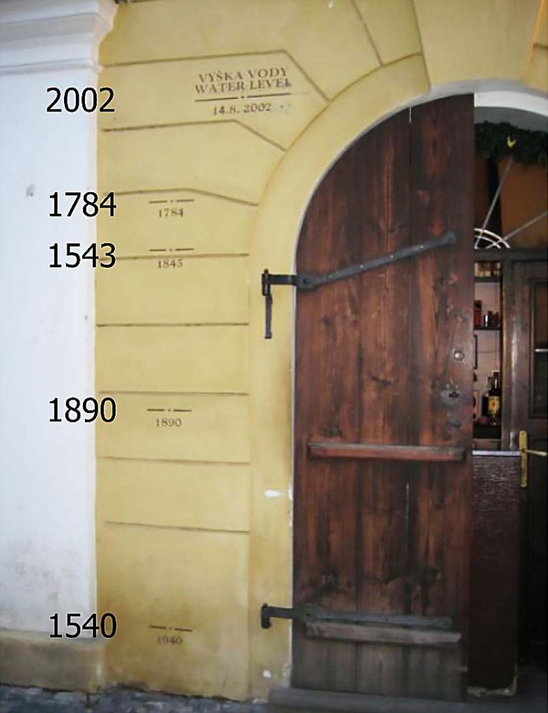 Η τέταρτη φωτογραφία απεικονίζει μια πόρτα στην Πράγα, όπου κάποιοι σημείωναν τη στάθμη του νερού μετά από καταστροφικές πλημμύρες. (Σχ. 4). Η χαμηλότερη ένδειξη, σημειώθηκε για να καταγράψει ένα σημαντικό πλημμυρικό φαινόμενο το 1540. Εάν δει κανείς την καταγραφή μετά τις πλημμύρες του 2002, μπορεί εύκολα να καταλάβει το μέγεθος του φαινομένου που έπληξε την περιοχή.