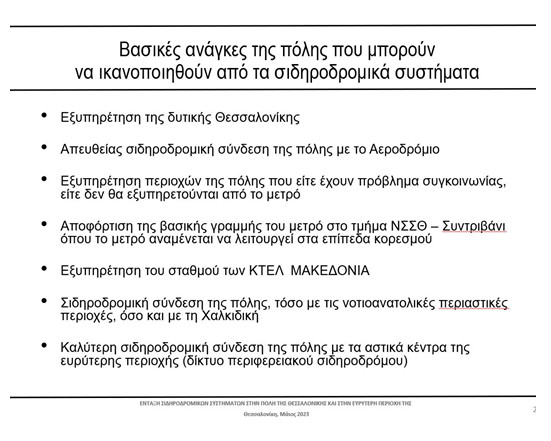 Η παρουσίαση που ακολουθεί αφορά στη συνεισφορά ΑΠΟΚΛΕΙΣΤΙΚΑ των σιδηροδρομικών συστημάτων μεταφορών στην επίλυση του κυκλοφοριακού προβλήματος της Θεσσαλονίκης και της ευρύτερης περιοχής και στο πλαίσιο αυτό θα αναλύσουμε την υφιστάμενη κατάσταση όσον αφορά την ένταξη των σιδηροδρομικών συστημάτων, αλλά και τις μελλοντικές προοπτικές.